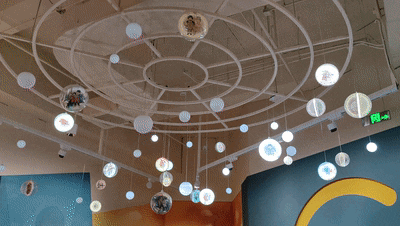 环幕投影《百年童书》用剪纸效果的神话形象串起了百年童书中经典形象。《十万个为什么》奇妙屋用六边形镜面营造了炫酷的视觉效果,小朋友可以在其中看到不同年代的“为什么”。