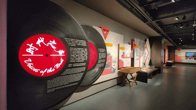 五楼的“时代之声”音像出版馆,将实体唱片和数字音频相结合,以时间线索,通过代表性的人、物、事以及声像载体技术的演变,展示中国百年音像出版业的发展历史,打造“可听见的历史与可看见的声音”。参观者可以拿起“上海街头留声机摊”的听筒,感受20世纪初⼈们的听音方式。馆内展示了《义勇军进行曲》首版唱片、赵元任灌录的《国语留声机片》、第一批中密纹唱片《黄河大合唱》,以及《四五花洞》《渔光曲》等各厂牌的名曲。馆内还有四面黑胶唱片墙,用粗纹、中密纹、大密纹、薄膜等不同唱片介质,分别展现流行金曲、梨园戏曲、红色歌曲与名家名曲,来者可通过耳机聆听穿越时光的声音。