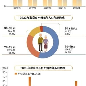 2022年,北京60岁及以上常住人口465.1万人,占总人口的21.3%;比2021年增加23.5万人,增幅5.3%,是近五年增量最多、增长幅度最大的一年,高于同期常住总人口增幅。65岁及以上常住人口330.1万人,占总人口的15.1%;比2021年增加18.5万人,增幅5.9%。