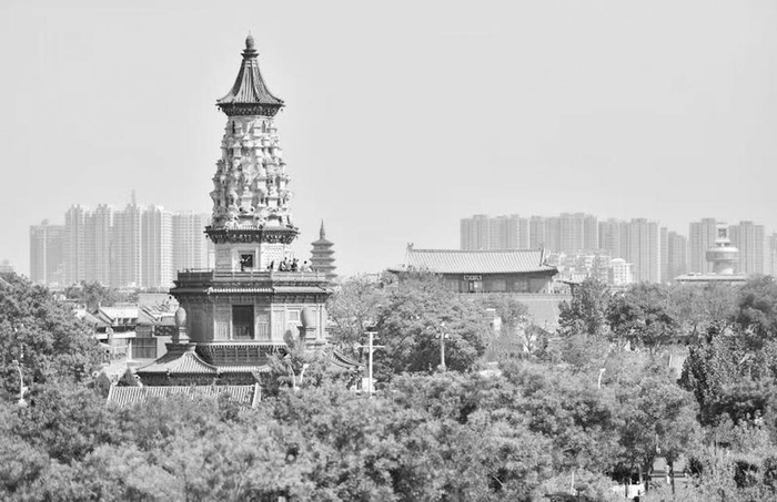 1933年,梁思成第一次来正定考察古建筑时,便注意到“这青塔在正定四塔中为最小一个,但清新秀丽,可算塔中上品”。澄灵塔历经1966年的地震,塔基的多块基石被震裂,顶端的塔刹也被震落。1986年,相关部门重修了受损严重的澄灵塔,并复建了临济寺内的天王殿、大雄宝殿、法乳堂和传灯堂。2001年,寺内又建起了圆通殿、药师楼以及东侧僧舍。