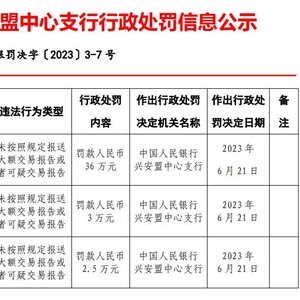 中国经济网北京6月30日讯 央行网站近日公布的中国人民银行兴安盟中心支行行政处罚信息公示(兴银罚决字〔2023〕3-7号)显示,蒙商银行股份有限公司兴安盟分行未按照规定报送大额交易报告或者可疑交易报告。中国人民银行兴安盟中心支行对其罚款人民币36万元。