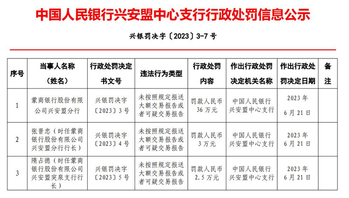 张晋忠(时任蒙商银行股份有限公司兴安盟分行行长)、隋占德(时任蒙商银行股份有限公司兴安盟突泉支行行长)、汤晓红(时任蒙商银行股份有限公司兴安盟扎赉特支行行长)、韩丹(时任蒙商银行股份有限公司兴安盟分行营业部总经理)分别被罚款人民币3万元、2.5万元、2.5万元、2.5万元。