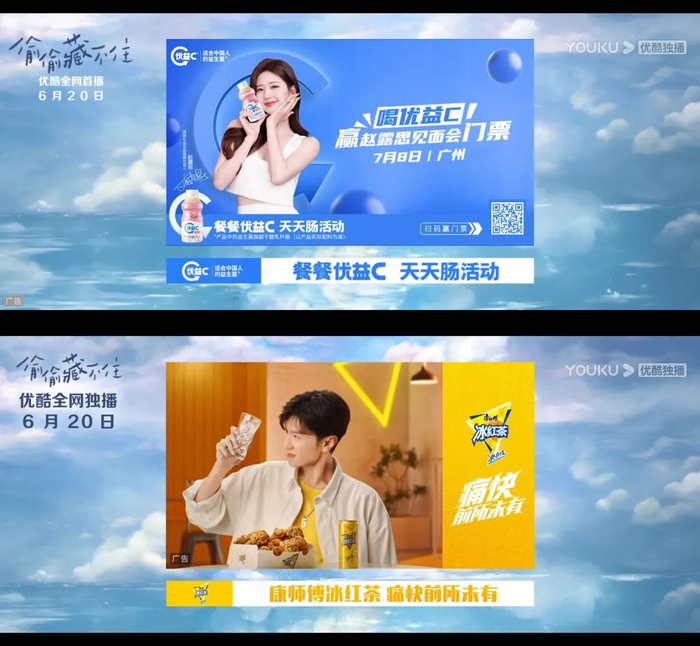 其中优益C 、冰红茶的代言人分别是这部剧的男女主演:赵露思和陈哲远,前者标注喝优益C可赢取赵露思7月8号广州见面会门票。
