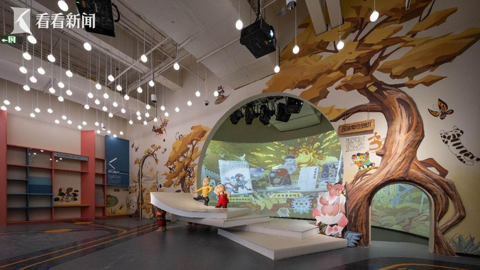 三楼儿童出版馆讲述童书百年发展史。环幕投影《百年童书》用剪纸效果的神话形象串起了百年童书中经典形象。《十万个为什么》奇妙屋用六边形镜面营造了炫酷的视觉效果,小朋友可以在其中看到不同年代的“为什么”。《小朋友》杂志上的气球,《稻草人》故事中的麦田,都被具象化实景还原在馆中。百年来的少儿出版物,结合众多趣味互动体验内容,给观众带去理想、勇气、正直、温暖和力量。