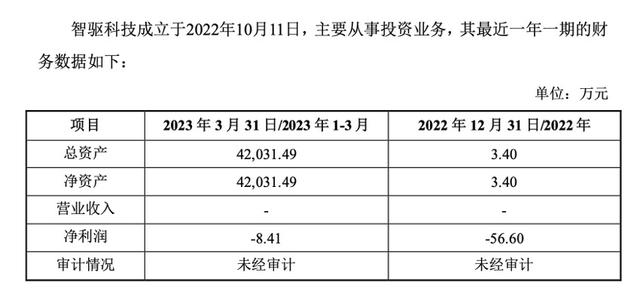值得一提的是,智驱科技近期业绩表现同样堪忧,去年总资产为3.4万元,净利润为-56.60万元。今年一季度总资产为4.2亿元,净利润为-8.41万元。