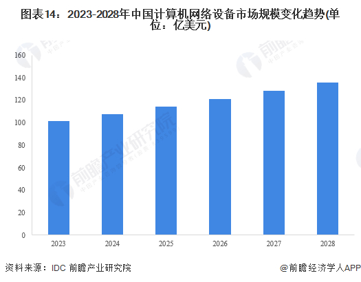 随着我国电信运营商的战略转型、邮政体制改革、电子政务、智慧城市等一系列重大行业发展项目的实施,将产生新一轮的IT设备采购浪潮,为计算机网络设备厂商带来广阔的新增市场空间。根据IDC发布的数据,预计2028年我国主要网络设备市场规模将超过135亿美元,年均复合增长率为5.95%。