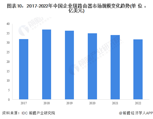 路由器是连接因特网中各局域网、广域网的网络通讯关键设备。路由器类似于互联多个网络或网段的枢纽,它能将不同网络或网段之间的数据信息进行“翻译”,以使它们能够相互“读懂”对方数据,从而构成一个更大的网络。路由器的处理速度是网络通信的主要瓶颈之一,其稳定性与可靠性直接影响网络互连的质量。根据IDC数据,国内运营商在2017、2018年进行大规模采购后,2019-2022年国内路由器市场规模有所下降。2022年,我国企业级路由器市场规模约为31亿美元,同比下跌6.7%。