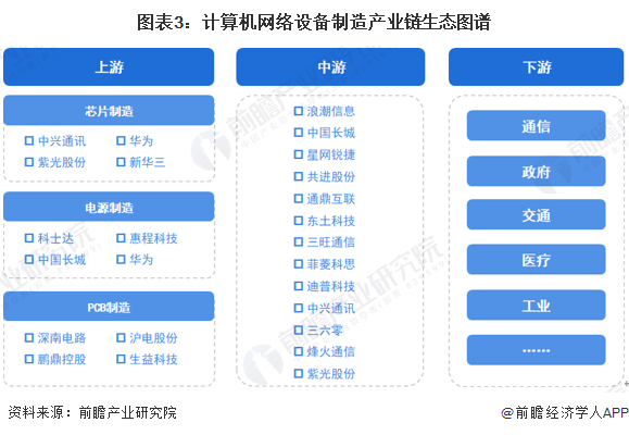 从计算机网络设备制造行业上中下游产业链参与企业来看,上游企业包括中兴、新华三、华为等硬件设计制造企业;计算机网络设备制造中游的企业则由紫光股份、中兴通讯、浪潮信息等企业构成。