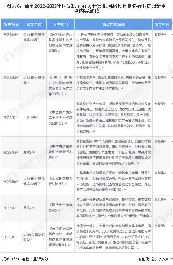 计算机网络设备制造行业是国家发展高科技装备制造业和信息产业的前沿科技行业,一直受到国家政策大力支持,政策主要以支持类为主。截至2023年6月我国计算机网络设备制造行业重点政策如下: