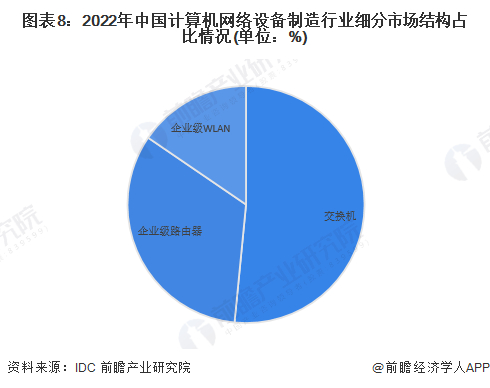 目前,我国计算机网络设备市场主要由交换机、路由器以及WLAN无线产品构成,其中交换机市场规模排第一,市场份额超过50%,路由器次之,WLAN产品位列第三。