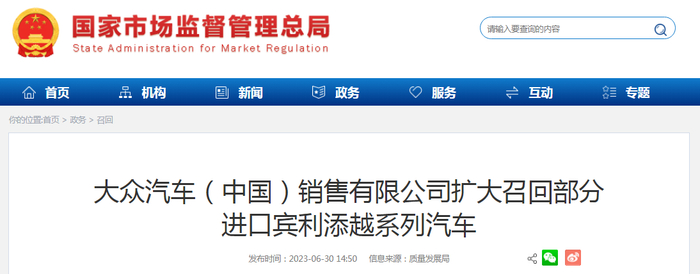 中国质量新闻网讯 据市场监管总局网站6月30日消息,日前,大众汽车(中国)销售有限公司根据《缺陷汽车产品召回管理条例》和《缺陷汽车产品召回管理条例实施办法》的要求,向国家市场监督管理总局备案了召回计划。决定自即日起,召回2022年2月18日至2022年10月22日期间生产的部分进口添越系列汽车,共计888辆。本次召回属于2022年4月29日发布的《大众汽车(中国)销售有限公司召回部分进口宾利汽车》召回活动的扩大召回。
