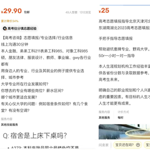 时代财经观察到,在淘宝、闲鱼、小红书等平台上,也有不少个人做起了志愿填报服务的生意,他们自称是往届毕业生或者是专业机构出身,咨询价格在几块钱到上千元不等。