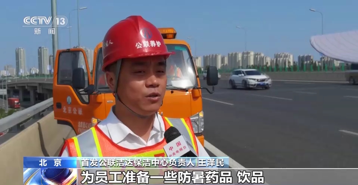 首发公联洁达保洁中心负责人 王泽民:现在的室外温度大概在37到38℃,但是地表温度现在应该是能达到65℃或者以上。在这样的天气下,我们保障道路畅通的同时,也采取了一些措施,为员工准备一些防暑药品、饮品,在保证道路通行的同时,保证我们的员工人身安全。