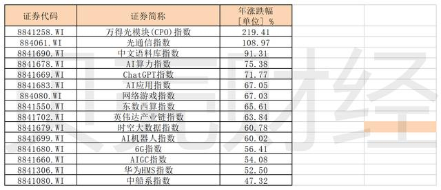 贝壳财经记者梳理看到,AI算力指数中,所有个股均表现出上涨趋势,中际旭创、天孚通信、新易盛三只个股领跑,涨幅均超过300%,此外,寒武纪、拓维信息、工业富联、光迅科技、中科曙光、浪潮信息等多只个股涨逾100%。
