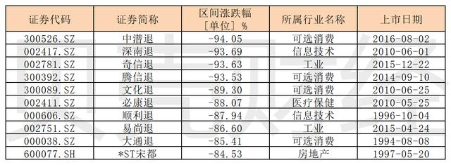 跌幅榜中,退市股和ST股领跌。其中,*ST宋都、大通退、易尚退、顺利退、必康退、文化退、腾信退、奇信退、深南退、中潜退等多只个股跌幅超过80%。其中,中潜退跌幅最大,达94.05%。