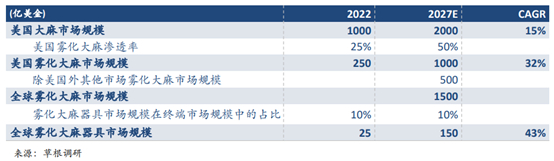 其中美国雾化大麻渗透率2015年不到5%,2022年已达25%。照此增长趋势,预计2027年渗透率可达50%,市场规模可达1000亿美元。