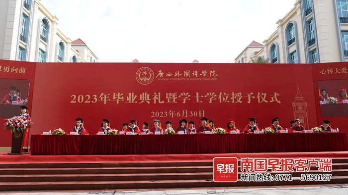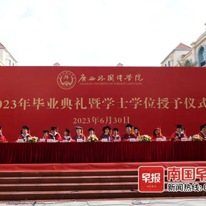6月30日上午,广西外国语学院在五合校区图书馆大厅举行2023年毕业典礼暨学士学位授予仪式,学校董事会领导、党政领导、毕业生代表、全体中层干部及毕业班班主任、辅导员参加。