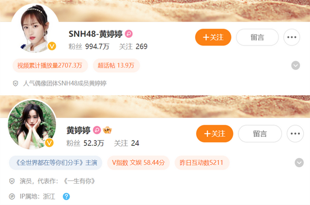值得一提的是,此前黄婷婷的千万粉丝微博账号@SNH48-黄婷婷早已停止使用,最近一次更新还在2019年11月,疑似已被收回。而目前其使用的微博账号@黄婷婷仅有52万粉丝。
