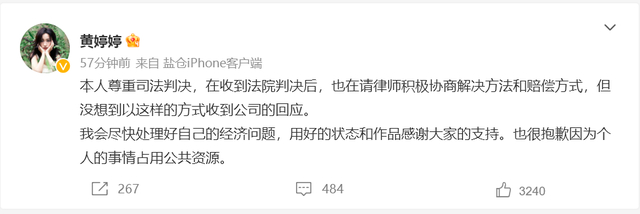 据此前报道,今年2月28日,SNH48成员黄婷婷在个人社交平台发文回应了自己被纳入失信被执行人名单一事,表示自己在请律师积极协商解决方法和赔偿方式,会尽快处理好自己的经济问题。