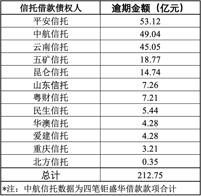 根据钜盛华披露的2021年年度审计报告和公司债券年度报告,2021年,钜盛华债务逾期总计375.04亿元。其中涉及12家信托公司、11家银行、3家证券机构以及多家其他机构“踩雷”。