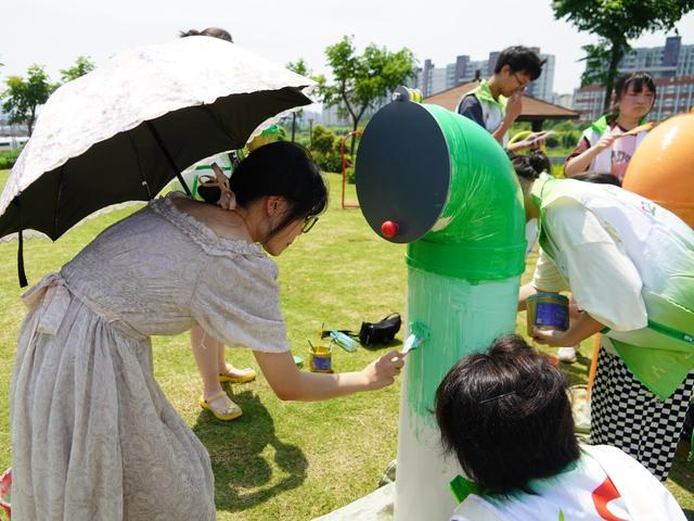 学生志愿者在带队老师的指导下,对4个蚯蚓塔进行彩绘装饰,有的画上可爱的蚯蚓,有的画上鲜花、小草、蝴蝶,还有的则写上“蚯蚓塔”“宠物粪便收集处”等文字,倡导市民快来使用。在志愿者们的巧手下,蚯蚓塔华丽变身。接着,在江桥镇农发公司志愿者的指导下,完成对蚯蚓塔的安装。