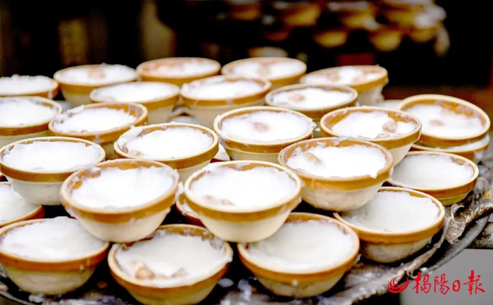 酵粿桃,又叫做水粿、钵仔粿,是用大米磨成米浆,装入特制的陶盅中高温蒸熟而成。蒸熟的酵粿桃中间会自然下陷,吃的时候油炸一遍,再蘸上调制的红糖酱油,口感爽滑。