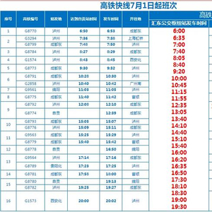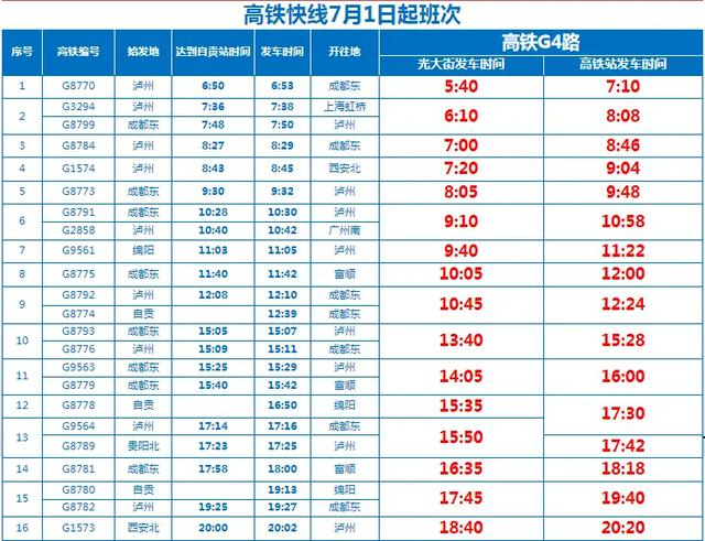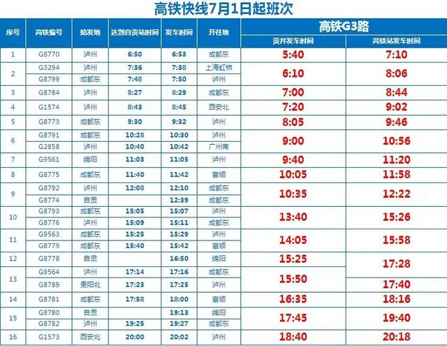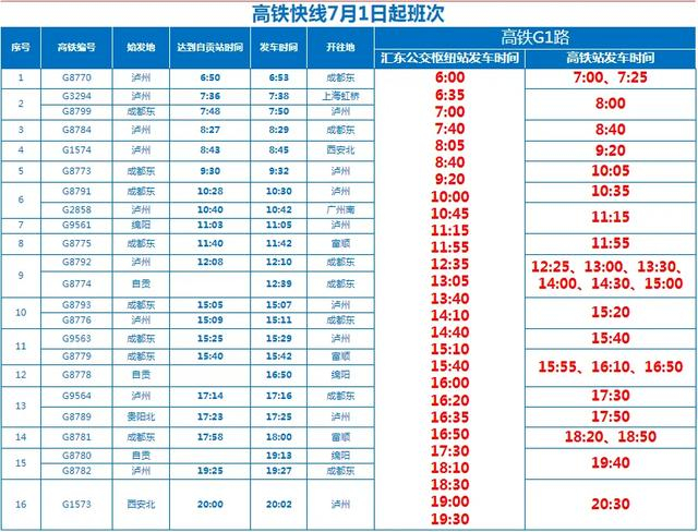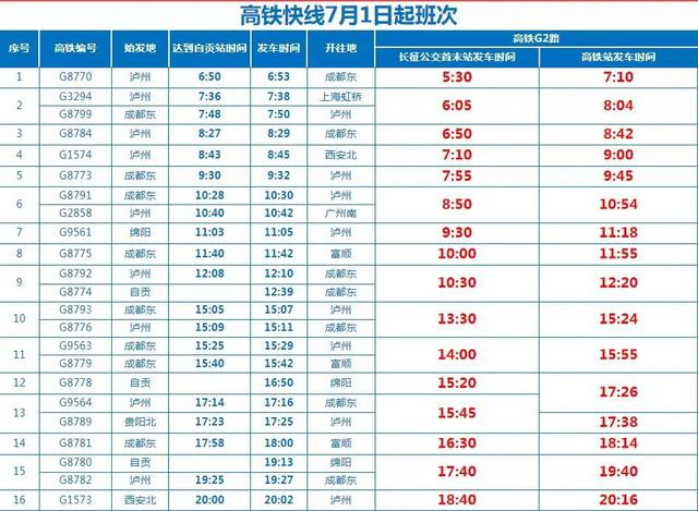 红星新闻记者从四川省自贡市公交集团获悉,根据自贡高铁站发布的7月1日最新高铁列车班次动态,自贡公交对照高铁列车班次时间变动情况,对公交高铁快线G1、G2、G3、G4路的发车时间做以下调整: