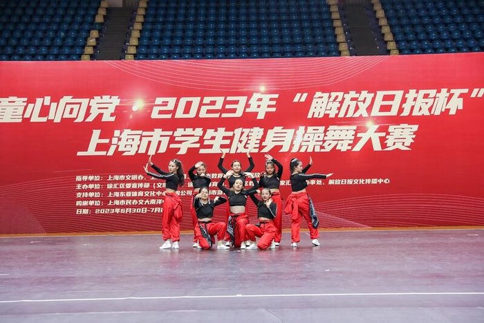 7月1日一早,王冬香老师在清点完人数后,两辆大巴从奉贤区明德外国语小学出发。大巴上有55个小朋友,还有他们的家长后勤团队。上海中学的高三女生卢一林把演出服整理好放进包里,赶到学校,她要跟队友们再排练几次。上海五十四中学老师张馨在微信群里又叮嘱了学生们注意事项,还不忘给孩子们加油。在彻底享受这个暑假前,他们将赴一场“青春派对”。6月30日至7月1日,2023年“解放日报杯”上海市学生健身操舞大赛在华东师范大学体育馆举行。比赛分幼儿组、中小学组、高校组、高职高专组和俱乐部组,设健身操舞、啦啦操、街舞等项目,共有来自全市的77所学校和俱乐部的105支队伍、共2100余人次参加比赛。