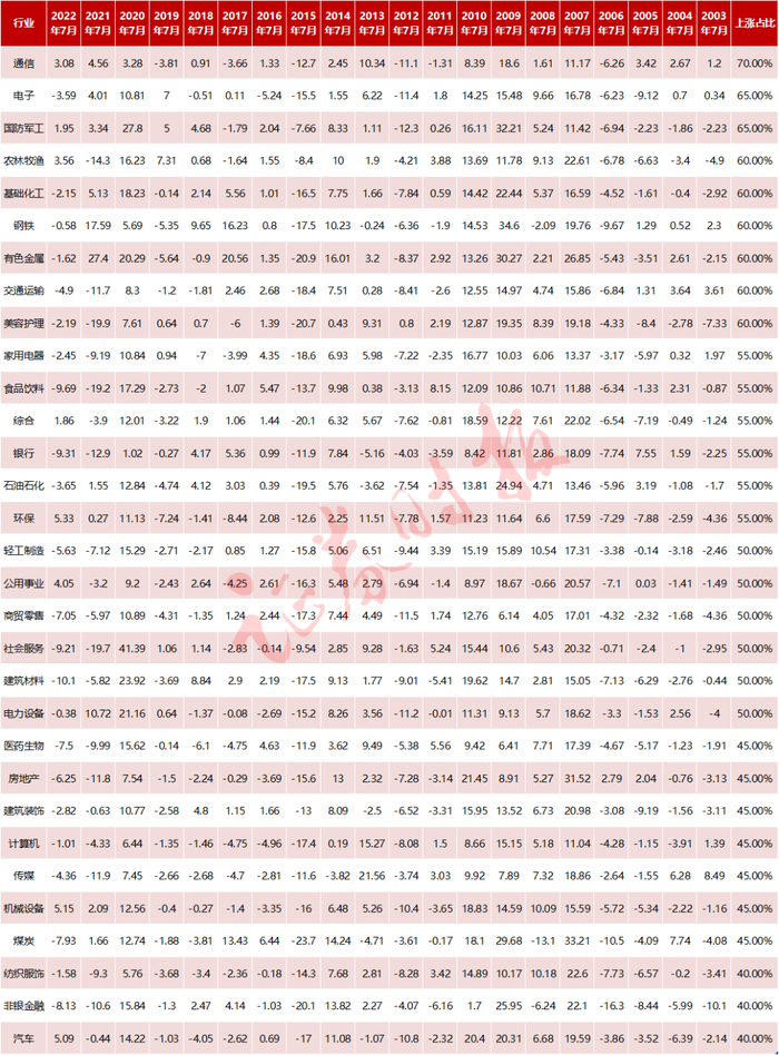 从具体板块来看,记者统计了申万31个行业近20年(2003年7月至2022年7月)的单月涨跌幅。结果显示,通信板块上涨次数占比最高,达70%;电子、国防军工为65%;农林牧渔、基础化工、钢铁、有色金属、交通运输等多个行业达60%。