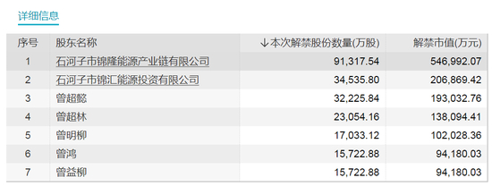 解禁市值第二大的天山铝业,解禁股东为石河子市锦隆能源产业链有限公司、石河子市锦汇能源投资有限公司、曾超懿、曾超林等7个股东,其中石河子市锦隆能源产业链有限公司为天山铝业第一大股东,曾超懿、曾超林为天山铝业实际控制人。这些股东下周解禁的股份来自于天山铝业2020年7月完成的定增,彼时定增发行价为4.59元/股。