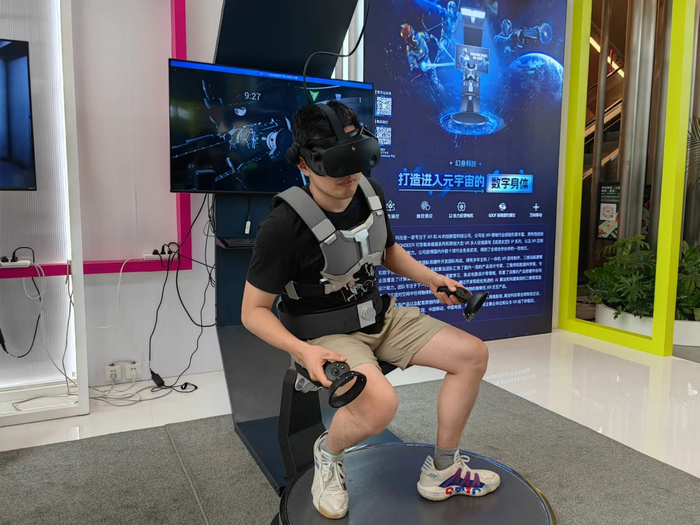 头图为戴着头显、身穿体感服的工作人员在VR游戏中体验太空漂浮。于玘珺 摄影