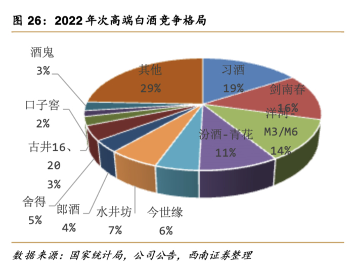 国联证券4月19日研报显示,白酒行业呈现“一超多强”的竞争格局,贵州茅台独占鳌头,五粮液、洋河股份、泸州老窖等龙头企业紧随其后。高端白酒行业清晰,飞天茅台(茅台)、普五(五粮液)、国窖1573(泸州老窖)三分天下,茅台占据了将近一半市场。在次高端白酒市场,西南证券研报梳理,习酒、剑南春、洋河股份、青花汾酒(山西汾酒)、今世缘、水井坊、郎酒、舍得酒业、古井贡酒、口子窖、酒鬼酒等众多产品力或渠道力较强的品牌竞相涌入。