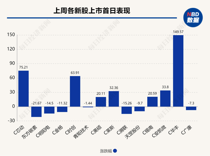 上周,新股市场有14家公司首发上市,包括来自创业板的C明阳电(301291)(SZ301291,股价32.60元,市值101.78亿元)等6家公司,来自科创板的C华丰(SH688629,股价23.22元,市值107.04亿元)等5家公司,以及来自北交所的东方碳素(BJ832175,股价9.87元,市值11.75亿元)等3家公司。