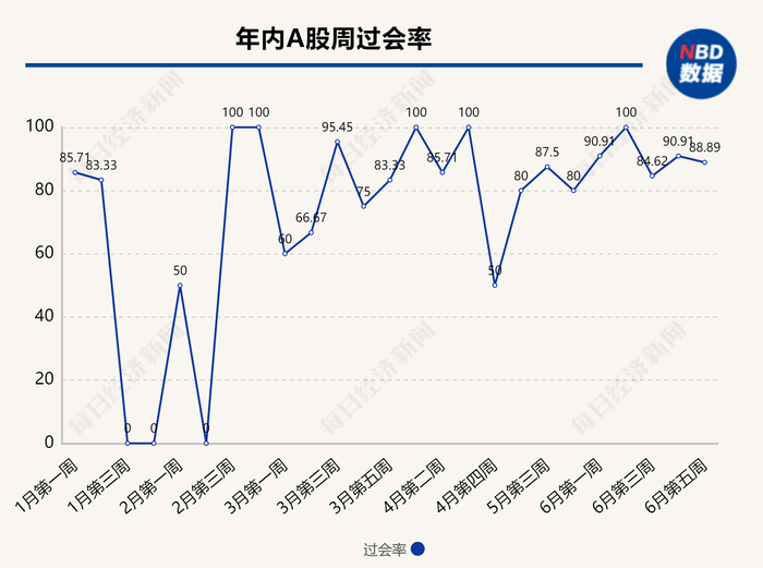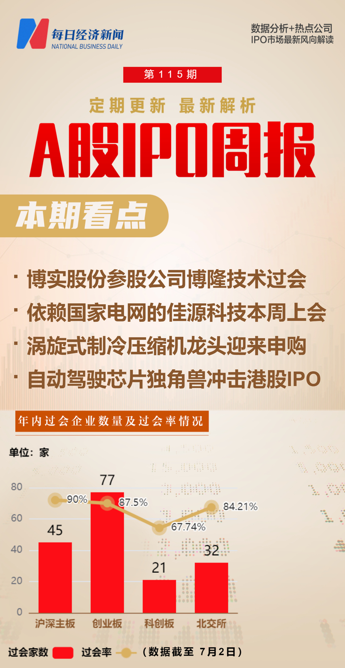 上周(6月26日至7月2日,下同),A股市场总共有9家公司被安排首发上会,其中8家过会,拟上市上证主板的金龙股份被暂缓表决,IPO周过会率也因此下降至88.89%。