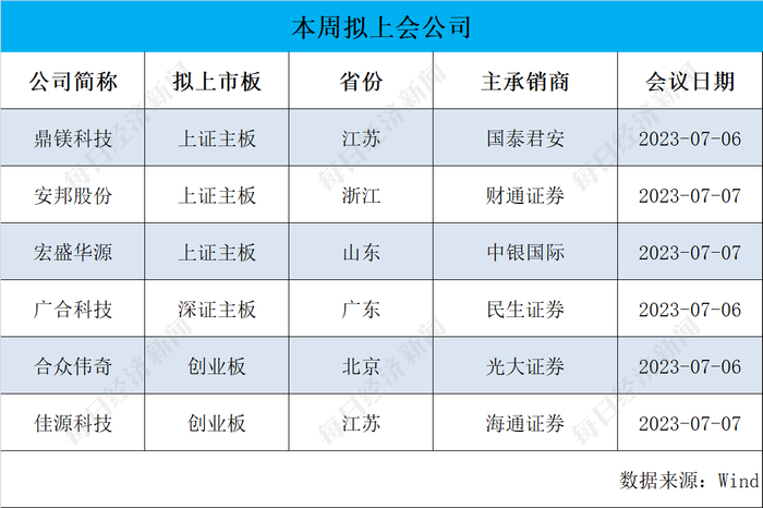 本周,A股市场有6家公司迎来首发上会,分别为来自上证主板的鼎镁科技等3家公司,创业板的合众伟奇和佳源科技2家公司,以及深证主板的广合科技。
