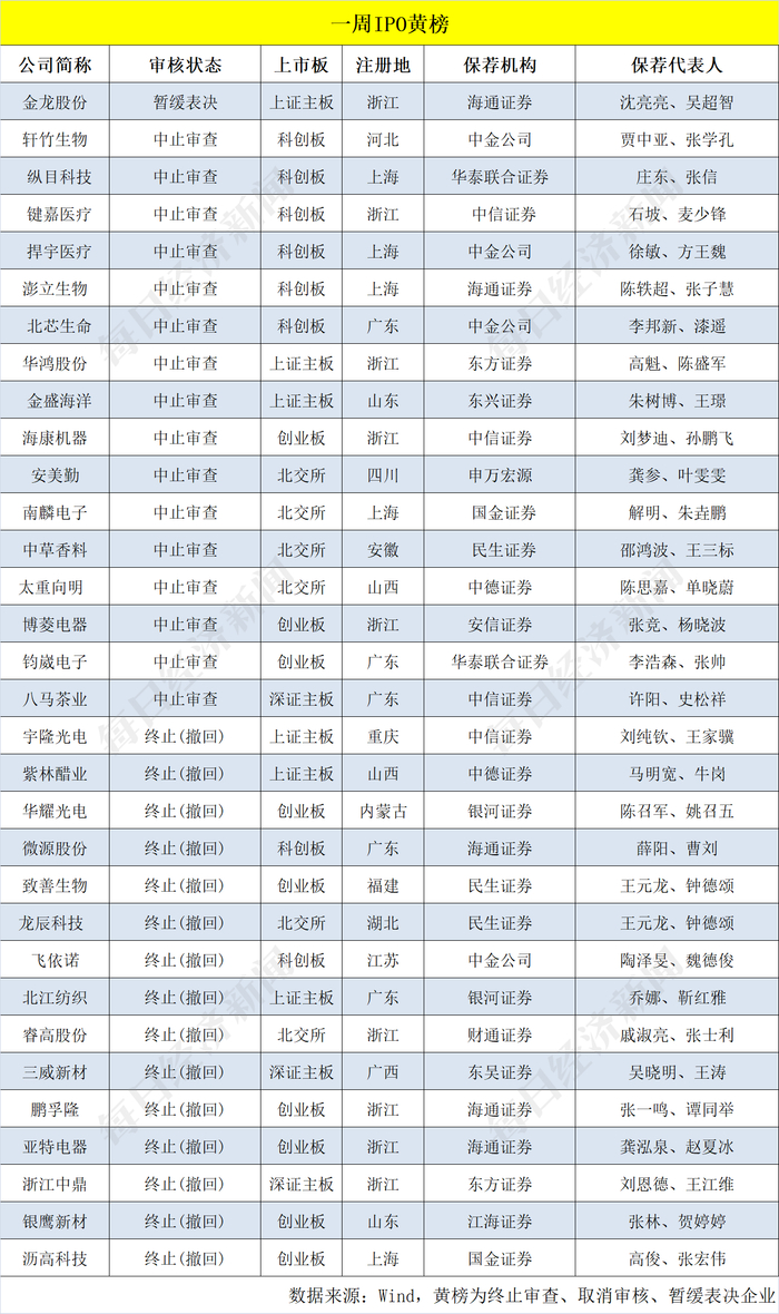 上周,总共有32家公司入列“黄榜”,除了上会被暂缓表决的金龙股份外,还有飞依诺等15家公司主动撤回IPO项目,以及博菱电器等16家公司中止审查。