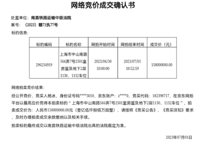 7月1日,京东房产拍卖页面显示,“上海市中山南路566弄7号2501室房屋及地下2层1130、1132车位”以1.58亿元的价格成交,较起拍价1.25亿元溢价26.4%。据京东房产页面上的拍卖信息,这套住宅建筑面积为458.78平方米,位于绿城黄浦湾楼王——7号楼的25层,是一套高区江景大平层。