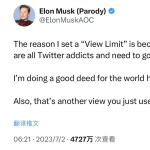 除了将限制第三方抓取推特数据作为对用户进行浏览量限制的理由,推特老板马斯克还发推文补充称:“我设置推文浏览量限制的原因是因为我们都是‘推特成瘾者’,每天大家都恍惚于网络世界,(所以)我这是在为世界做一件好事,大家应该都离手机远点,需要到外面去多进行社交活动,多去看看你的朋友和家人。”马斯克在推文的最后还调侃:“你又用了一次浏览次数 “。