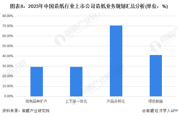 造纸行业上市公司2023年业务规划主要方向为项目扩产、产业一体化、产品多样化、绿色制造等,布局现有品种产能扩张规划的企业约占30%;布局产业链上下游一体化的企业约占30%;布局产品多样化、高端产品品种研发等的企业约占70%;布局绿色制造的企业约占40%。
