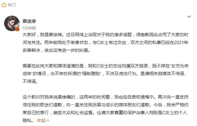 大家好,我是蔡徐坤。近日网络上出现关于我的诸多话题,很抱歉因此占用了大家的时间与关注。两年前我处于单身状态,与C女士有过交往,双方之间的私事已经在2021年妥善解决,彼此没有进一步的纠葛。