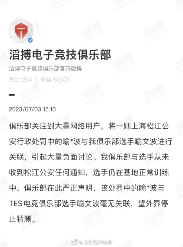 7月3日,@滔搏电子竞技俱乐部辟谣:俱乐部关注到大量网络用户,将一则上海松江公安行政处罚中的喻*波与我俱乐部选手喻文波进行关联,引起大量负面讨论。我俱乐部与选手从未收到松江公安任何通知,选手仍在基地正常训练中。俱乐部在此严正声明,该处罚中的喻*波与TES电竞俱乐部选手喻文波毫无关联,望外界停止猜测。