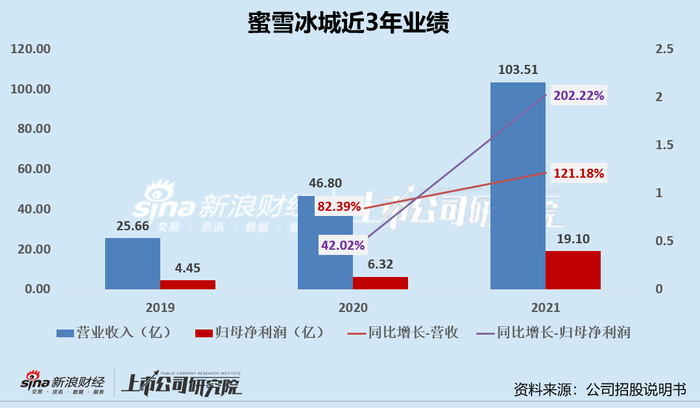 2019-2021年(公司招股书仅披露至2021年报,无最新数据)蜜雪冰城的营业收入分别为25.66亿元、46.80亿元、103.51亿元,2020、2021年营收分别同比增长82.39%、121.18%;2019-2021年蜜雪冰城的归母净利润分别为4.45亿元、6.32亿元、19.10亿元,2020、2021年分别同比增长42.02%、202.22%。