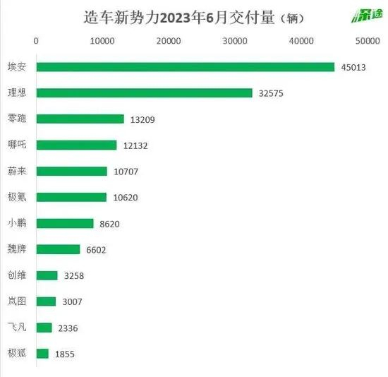 截至7月1日公布的数据,埃安连续四个月交付超四万辆,6月交付新车45013辆;理想又是毫无悬念,冲破了三万辆,完成32575辆的交付,而其他几家还在一万辆上下徘徊。