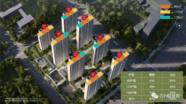 户型排布为中间99㎡户型,边户是115和139㎡户型。