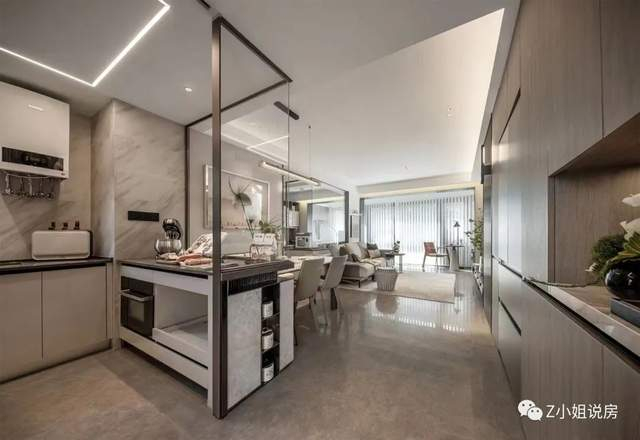 厨房玻璃设计,加大交互性空间,更便于查看客厅状态。