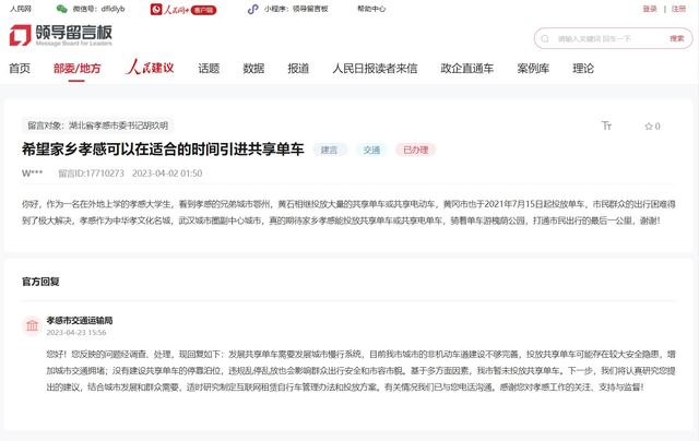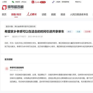 上述网友在2023年4月初的留言中称,作为一名在外地上学的孝感大学生,看到孝感兄弟城市鄂州、黄石相继投放大量的共享单车或共享电动车,黄冈市也于2021年7月15日起投放单车,市民群众的出行困难得到了极大解决,孝感作为中华孝文化名城,武汉城市圈副中心城市,真的期待家乡孝感能投放共享单车或共享电单车,骑着单车游槐荫公园,打通市民出行的最后一公里。
