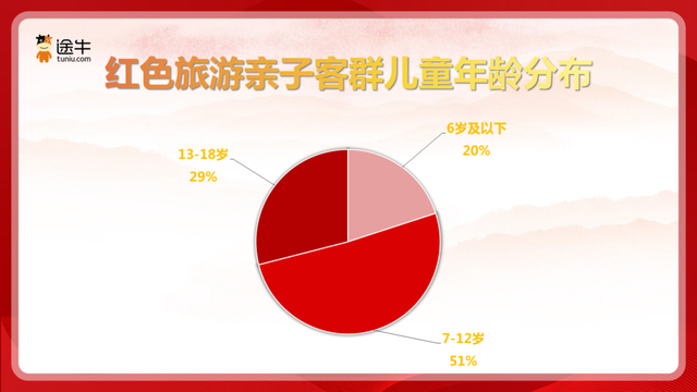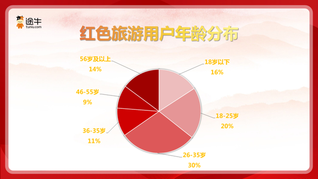 近年来,越来越多的年轻客群、亲子家庭主动参与到红色旅游中来。途牛旅游网数据显示,今年上半年参与红色旅游的用户中,年龄在26-35岁的中青年用户出游人次占比最高,达到了30%;其次是18-25岁的用户,出游人次占比为20%。从数据来看,中青年用户已成为红色旅游的消费主力。