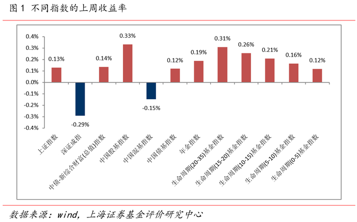 养老生命周期基金系列指数上周全部上涨,生命周期(20-35)指数较上周上涨0.31%、生命周期(15-20)指数较上周上涨0.26%、生命周期(10-15)指数较上周上涨0.21%、生命周期(5-10)指数较上周上涨0.16%、生命周期(0-5)指数较上周上涨0.12%。从相对表现来看,生命周期(0-5)指数上周表现与债券市场走势趋同,生命周期(20-35)指数较上证综指高0.18%,较深证成指高0.60%。