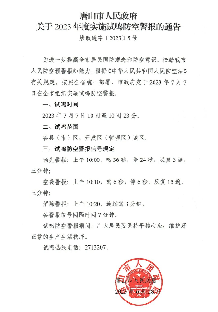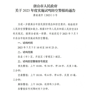 为进一步增强广大市民的国防观念和人民防空意识,提升市民对防空警报音响的识别能力,根据《中华人民共和国人民防空法》《河北省实施〈中华人民共和国人民防空法〉办法》和全省统一进行防空警报试鸣的要求。市政府决定于2023年7月7日上午10:00,在我市主城区及所辖县、市区实施防空警报试鸣,时长23分钟。现通告如下: