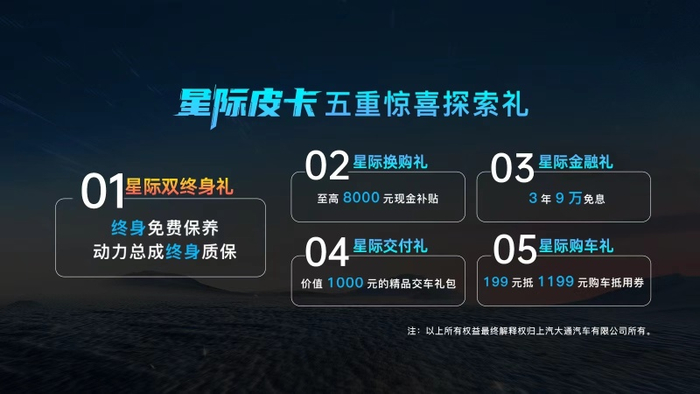 此外,星际皮卡还为购车用户带来了惊喜探索礼,包括星际双终身礼:终身免费保养动力总成终身质保、星际换购礼:至高 8000 元现金补贴、星际金融礼:3年9 万免息、星际交付礼:价值 1000 元的精品交车礼包、以及星际购车礼:199 元抵 1199 元购车抵用券五重好礼。